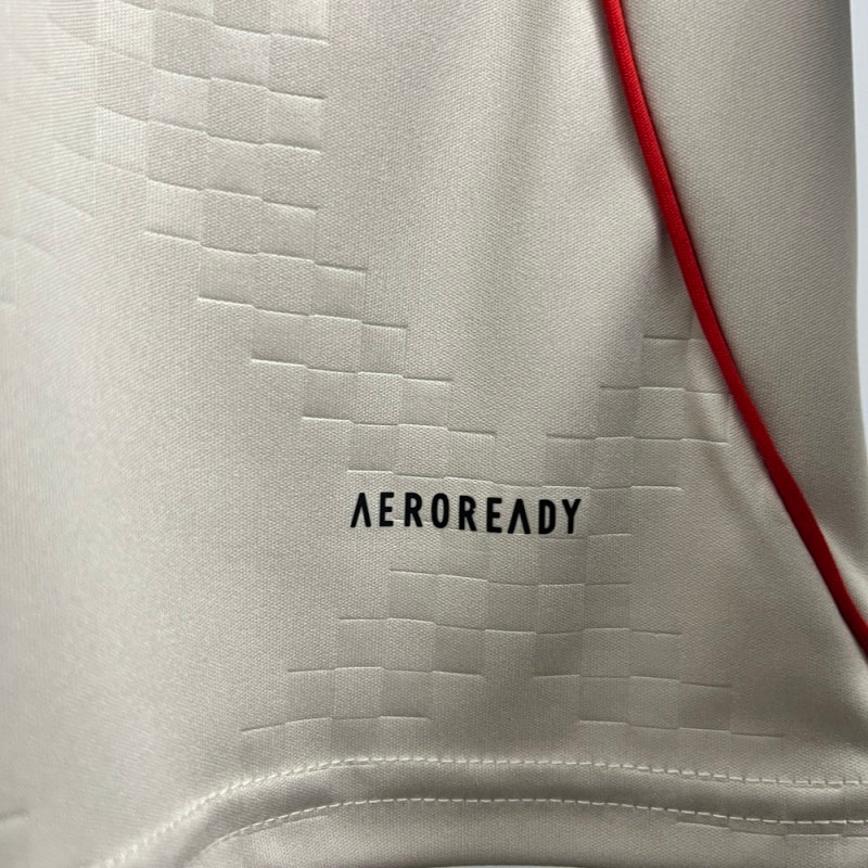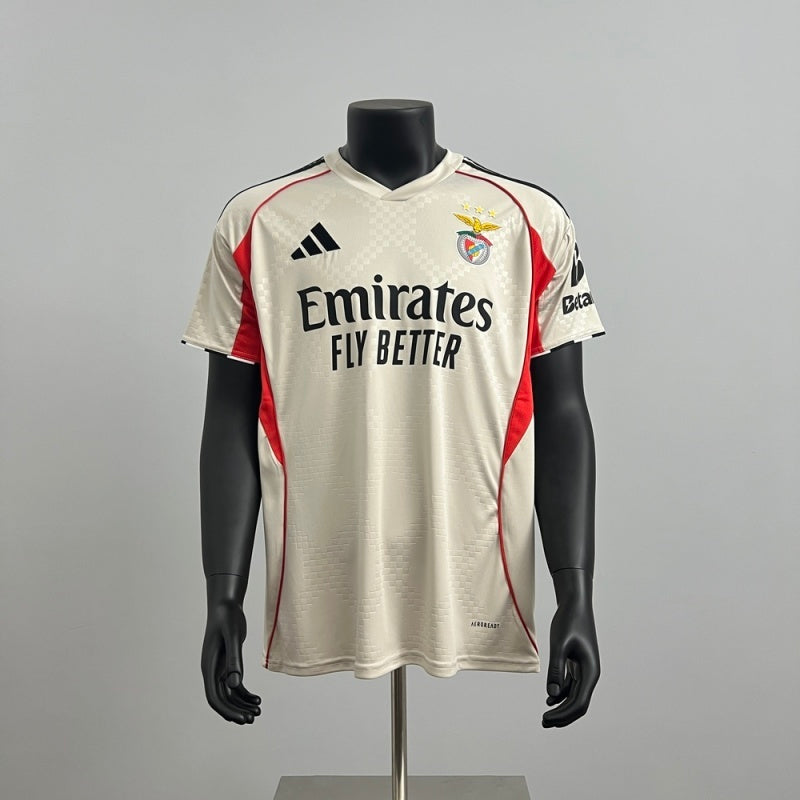 La nuova Away 25/26 del Benfica si distingue per il suo stile moderno e pulito, con una base beige chiaro arricchita da dettagli rossi e neri che richiamano i colori storici del club. Una maglia elegante che unisce tradizione e innovazione, pensata per accompagnare i tifosi ovunque.