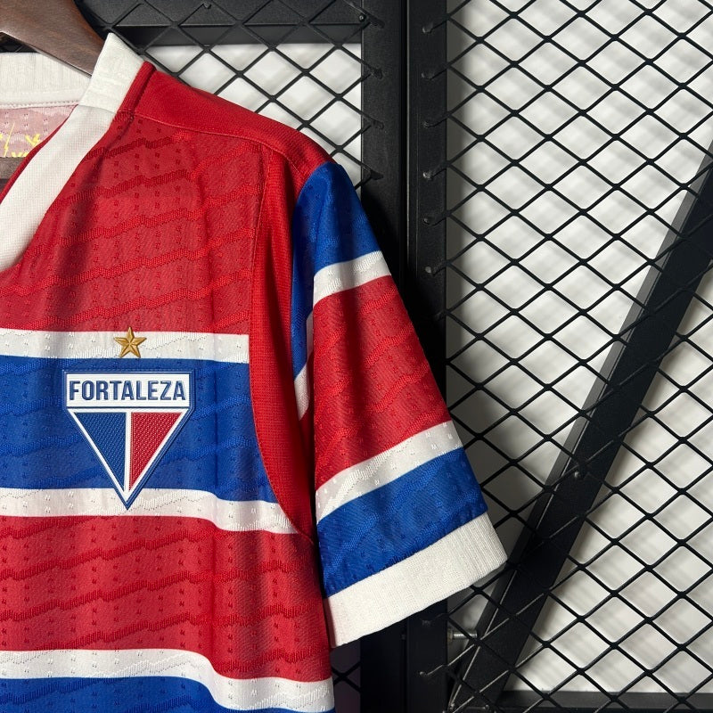 La maglia Home 25/26 del Fortaleza, firmata Volt, mantiene intatta la tradizione del club brasiliano con le classiche bande orizzontali rosse, blu e bianche. Un design iconico che celebra la passione e l’identità del Leão do Pici.