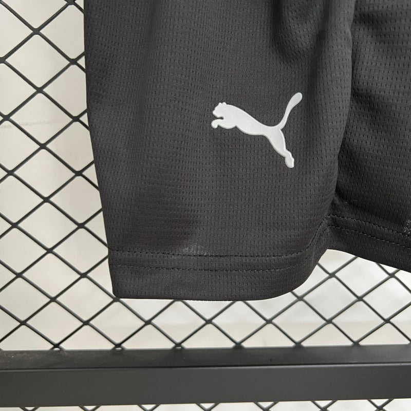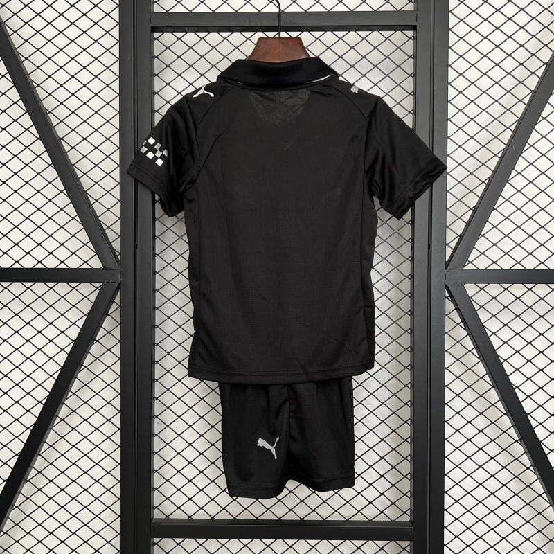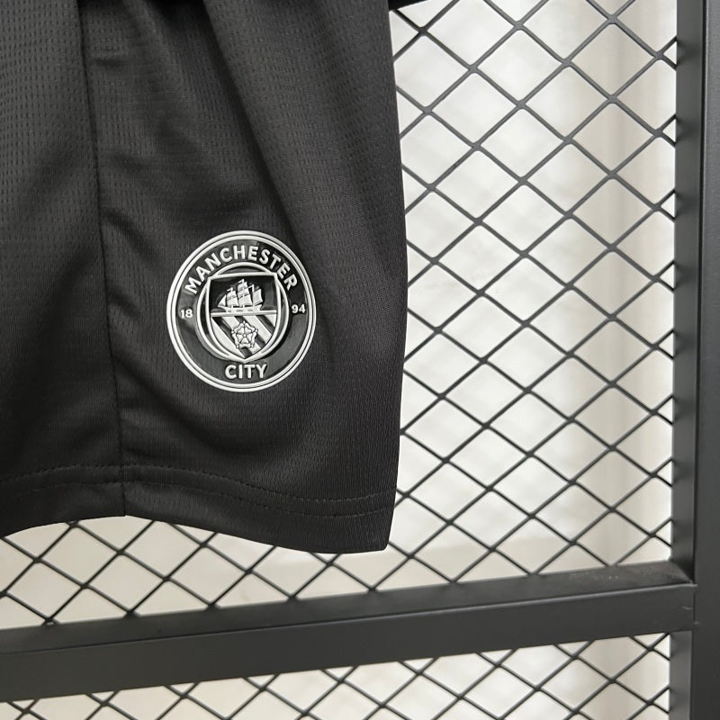Il kit bambini Away 2025/26 del Manchester City combina stile e potenza in un design completamente nero, simbolo della forza e della mentalità da campioni dei Citizens.