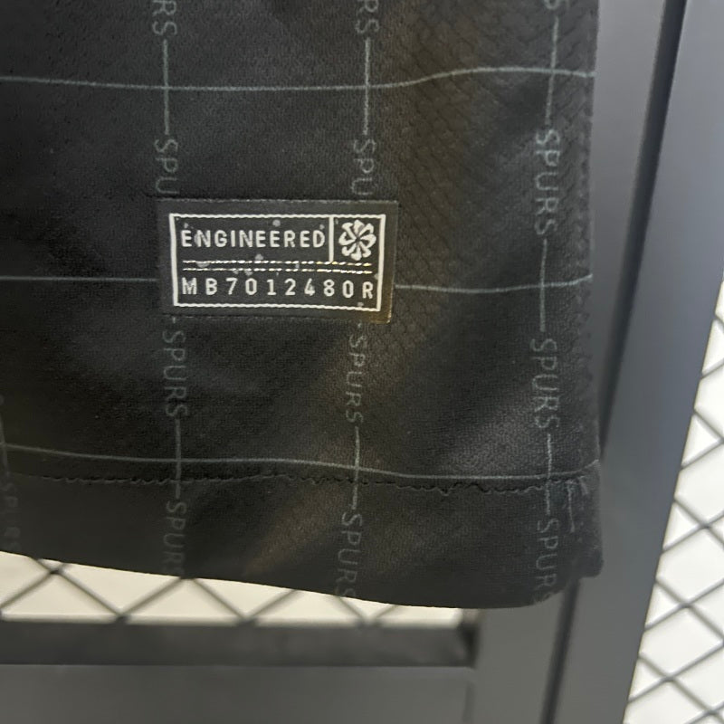 Dettagli in bianco argento su logo Nike, stemma Spurs e sponsor AIA