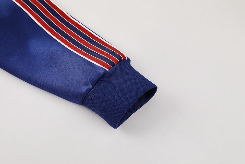 Giacca blu con zip integrale e dettagli rosso-bianchi sulle spalle