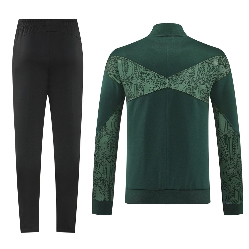 Il verde scuro con motivo geometrico “LONDON” e i pantaloni neri creano un contrasto elegante e deciso.